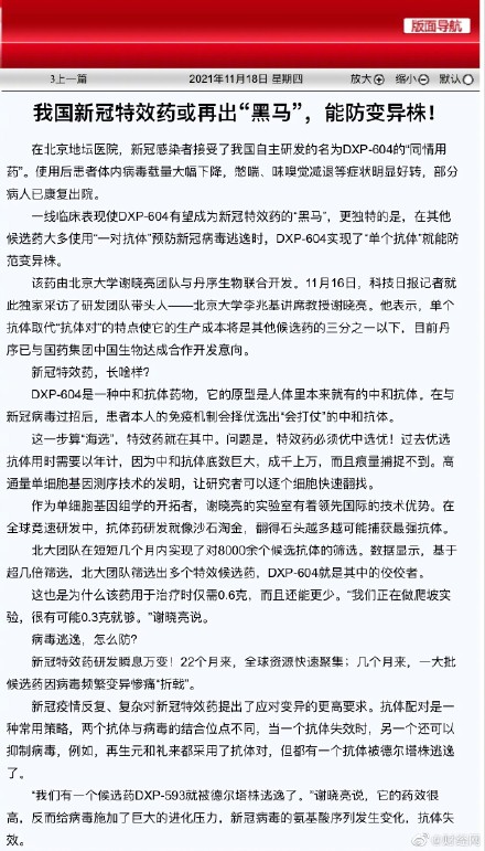 0.6克抗體一針,一針管一個(gè)月!在北京地壇醫(yī)院,新冠感染者接受了我國(guó)自主研發(fā)的名為DXP-604的“同情用藥”。使用后患者體內(nèi)病毒載量大幅下降,憋喘、味嗅覺減退等癥狀明顯好轉(zhuǎn),部分病人已康復(fù)出院。一線臨床表現(xiàn)使DXP-604有望成為新冠特效藥的“黑馬”,更獨(dú)特的是,在其他候選藥大多使用“一對(duì)抗體”預(yù)防新冠病毒逃逸時(shí),DXP-604實(shí)現(xiàn)了“單個(gè)抗體”就能防范變異株。